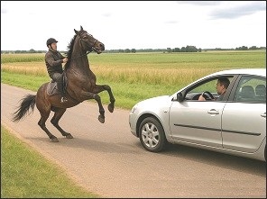 ![]() | Every driver must immediately slow down when approaching draft, pack, riding animals, or livestock on the public road. If a horse on the road gets scared by a car and rears up, the driver must stop the vehicle and avoid any sudden movements, so that the rider can calm the horse and regain control of the situation before it escalates. |
